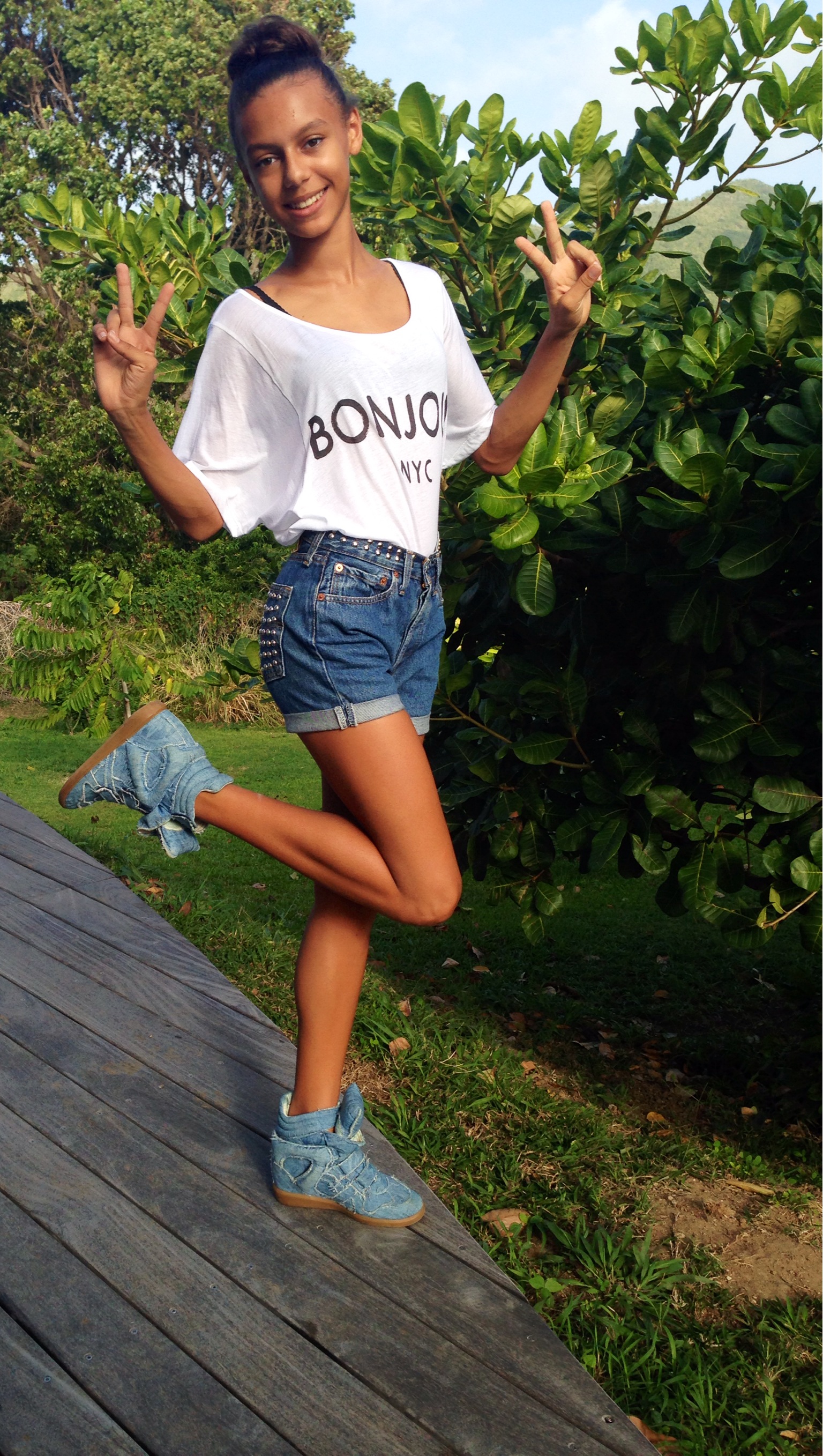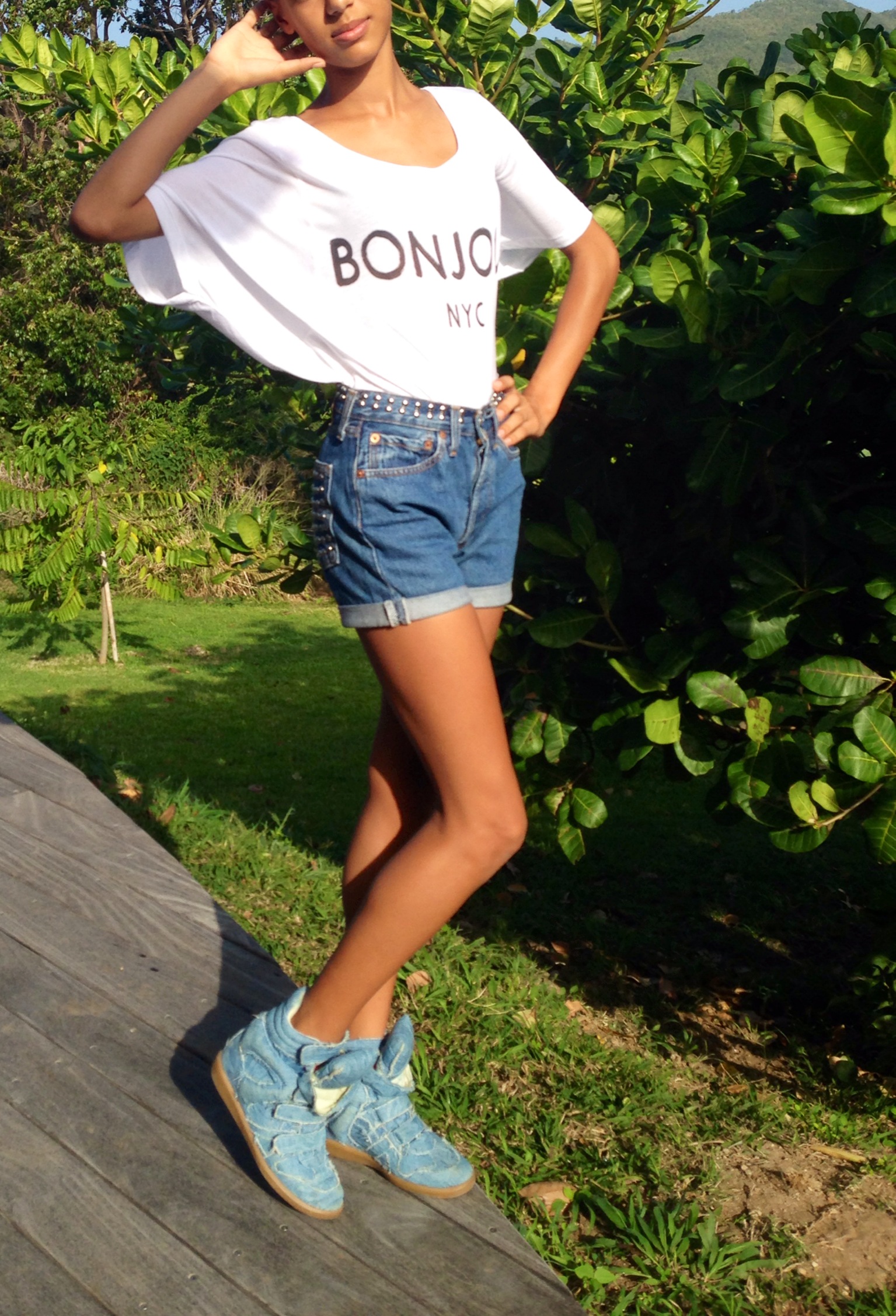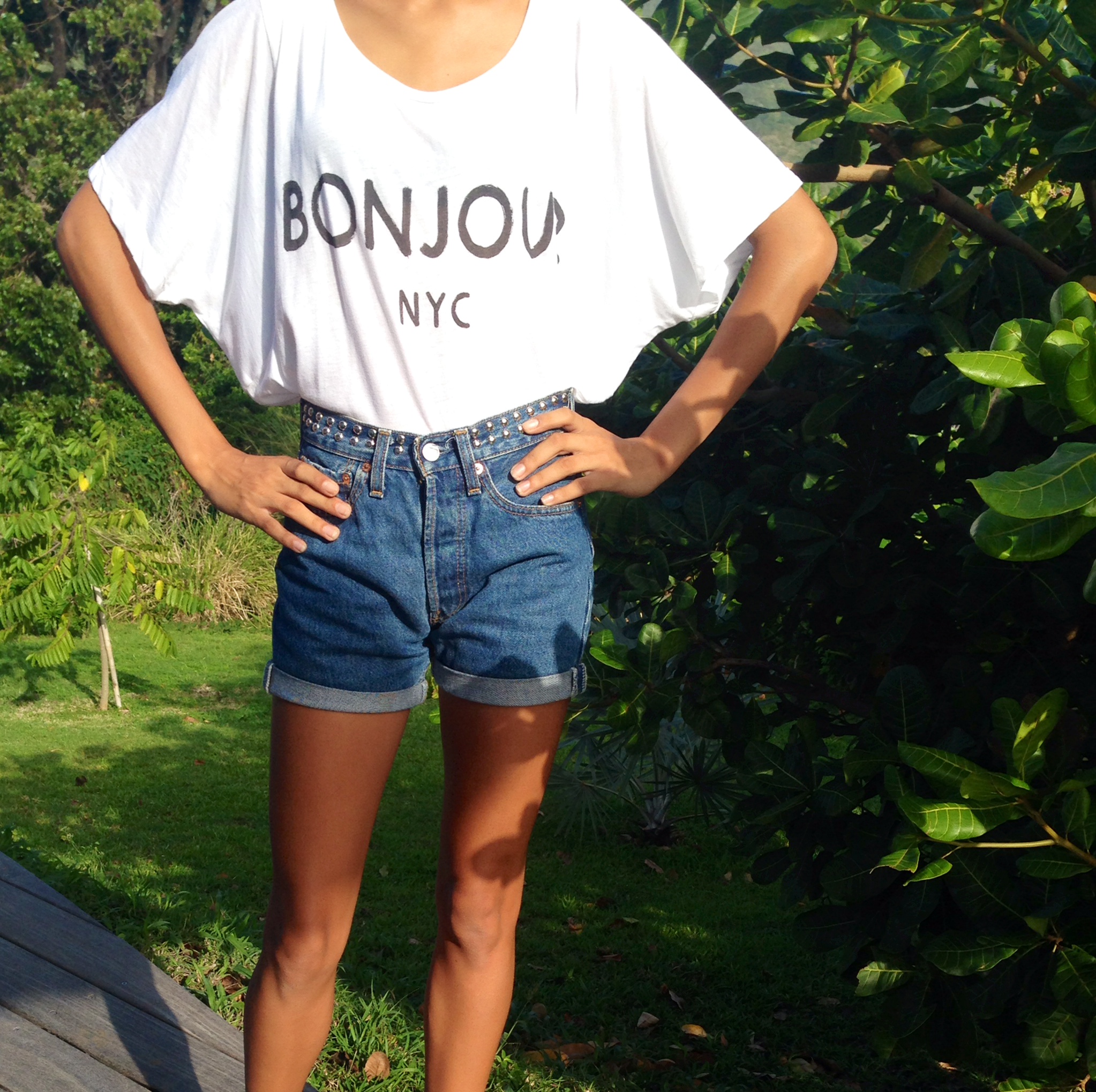 Aujourd’hui c’est dimanche et j’ai eu envie de de porter ma dernière trouvaille fashion trouvée en soldes : un short Levi’s clouté ! Je le porte de manière simple avec un tee shirt loose et des baskets compensées en jean. J’espère que ça vous plaira !